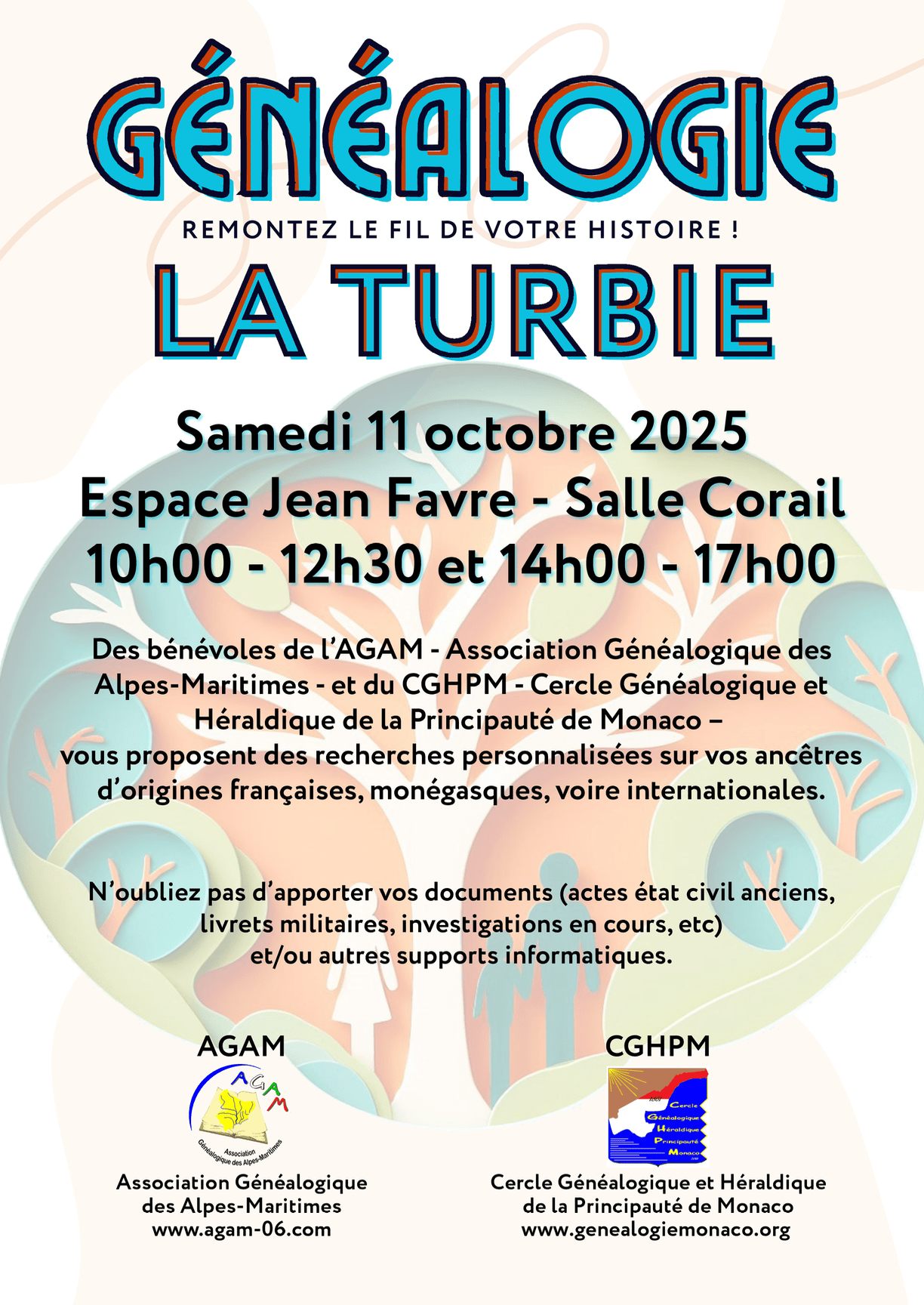 Le samedi 11 octobre 2025, l’Espace Jean Favre accueillera une journée entièrement consacrée à la recherche des origines familiales. À l’initiative de l’Association Généalogique des Alpes-Maritimes (AGAM) et du Cercle Généalogique et Héraldique de la Principauté de Monaco (CGHPM), des bénévoles passionnés proposeront au public un accompagnement personnalisé pour explorer leurs racines.